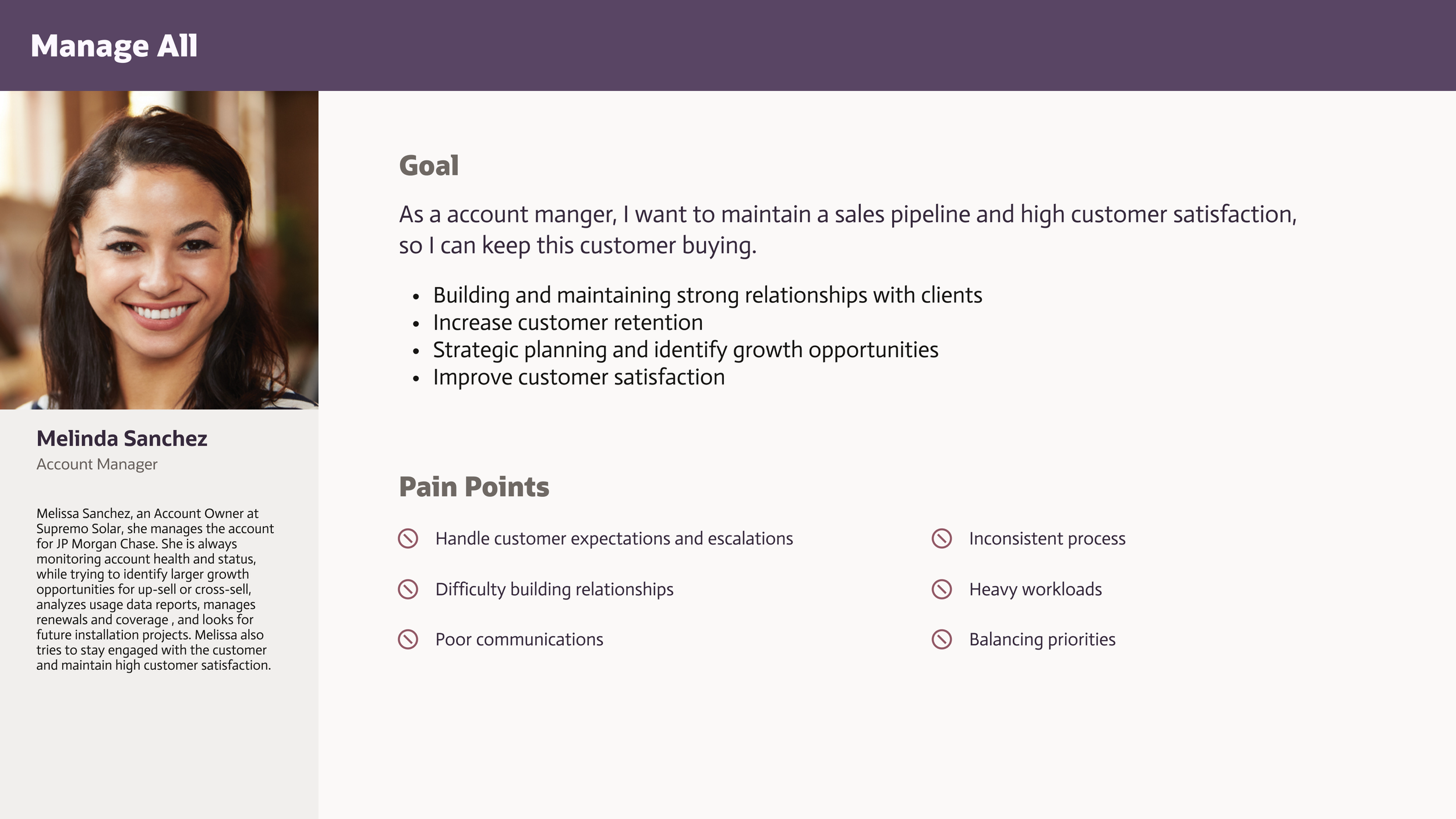 Identified sales managers, account managers, and sales reps as the primary users of the Account View, with a deep focus on the account manager’s journey and uncovering her story, goals, and challenges to inform and prioritize the design.